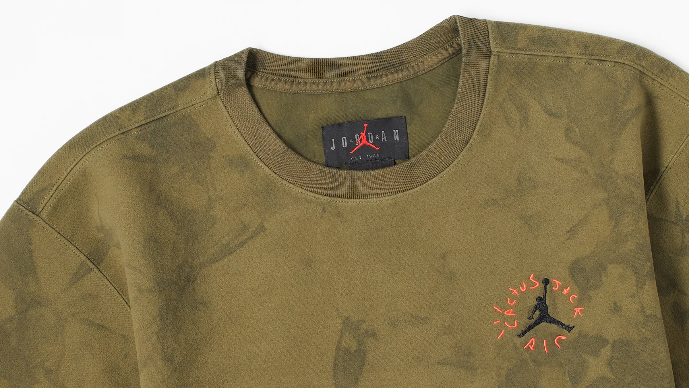 Influenced by Jordan Brands heritage and Scotts unique creative expression this limited time capsule release comprises of hoodies, cargo pants, t-shirts and a pair of shorts. Running in theme with the military influence from the matching sneaker, green olive and black serve as the base colours for the collection with pieces featuring a unique dying pattern providing a subtle camouflage effect.